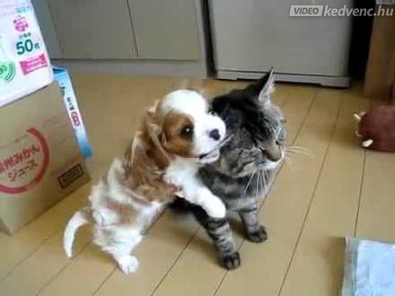 A kis spániel valami brutális vitalitással ölelgeti a család cicáját, aki mindezt rezignált arccal veszi tudomásul. Hát nem édesek?