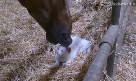 Úgy szereti, majd megeszi :) Majd' elolvadtunk ettől a pajtában készült felvételtől, amin a ló puszikat nyom a cica buksijára. Nézzétek,..