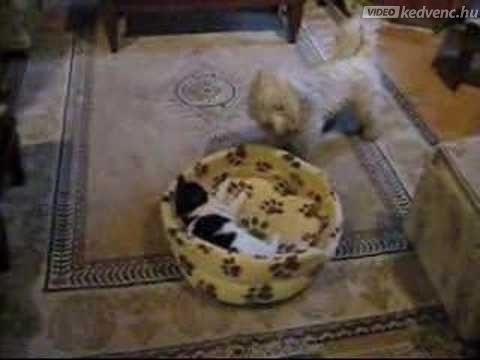 Ez már nem tréfa: Kutya és cica harcol a fekhelyért