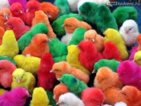 Húsvét előtt néhány héttel a tojásokba ártalmatlan ételfestéket fecskendeznek, így a kikelő napos csibék a szivárvány színeiben..