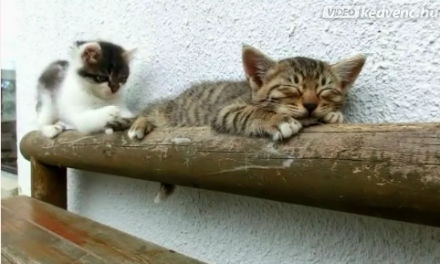 Vajon mit csinálhatott éjjel ez a kiscica, ha arra sem ébred fel, hogy a tesó ugrál a fején? Mindenesetre mindketten nagyon aranyosak!