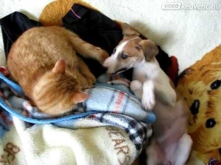 A cica rendre oktatja a magyar agár bébit. Hiába, a cica farka nem játék!