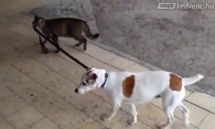 Hihetetlen: Cica sétáltatja a kutyát!